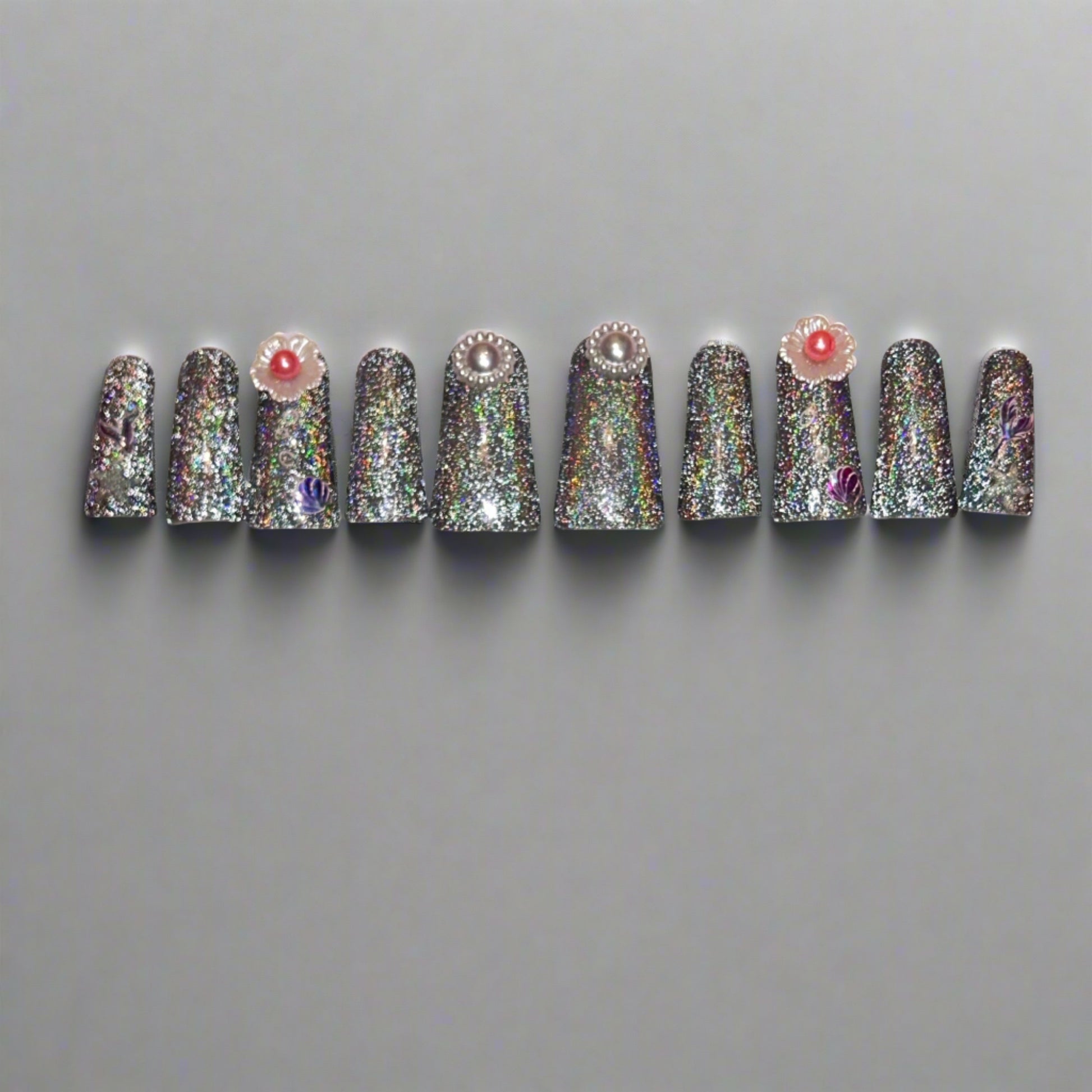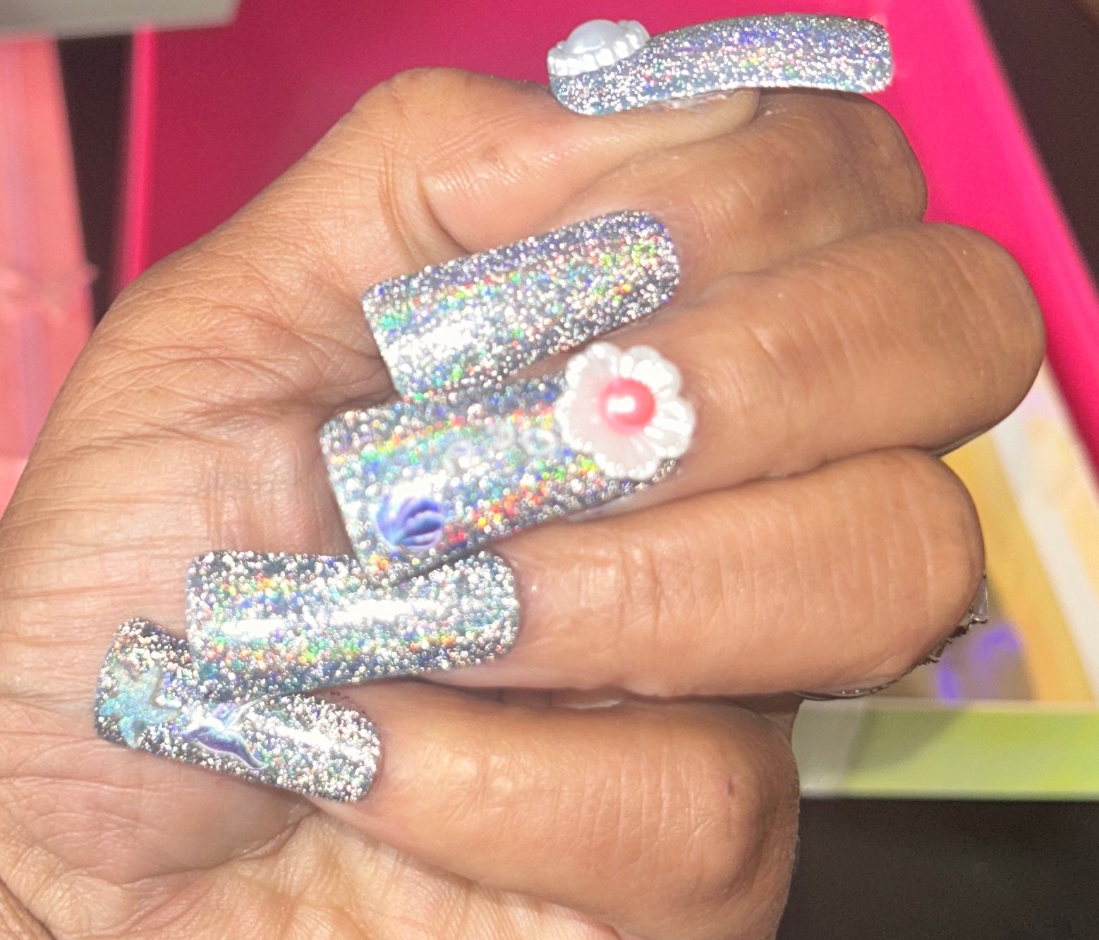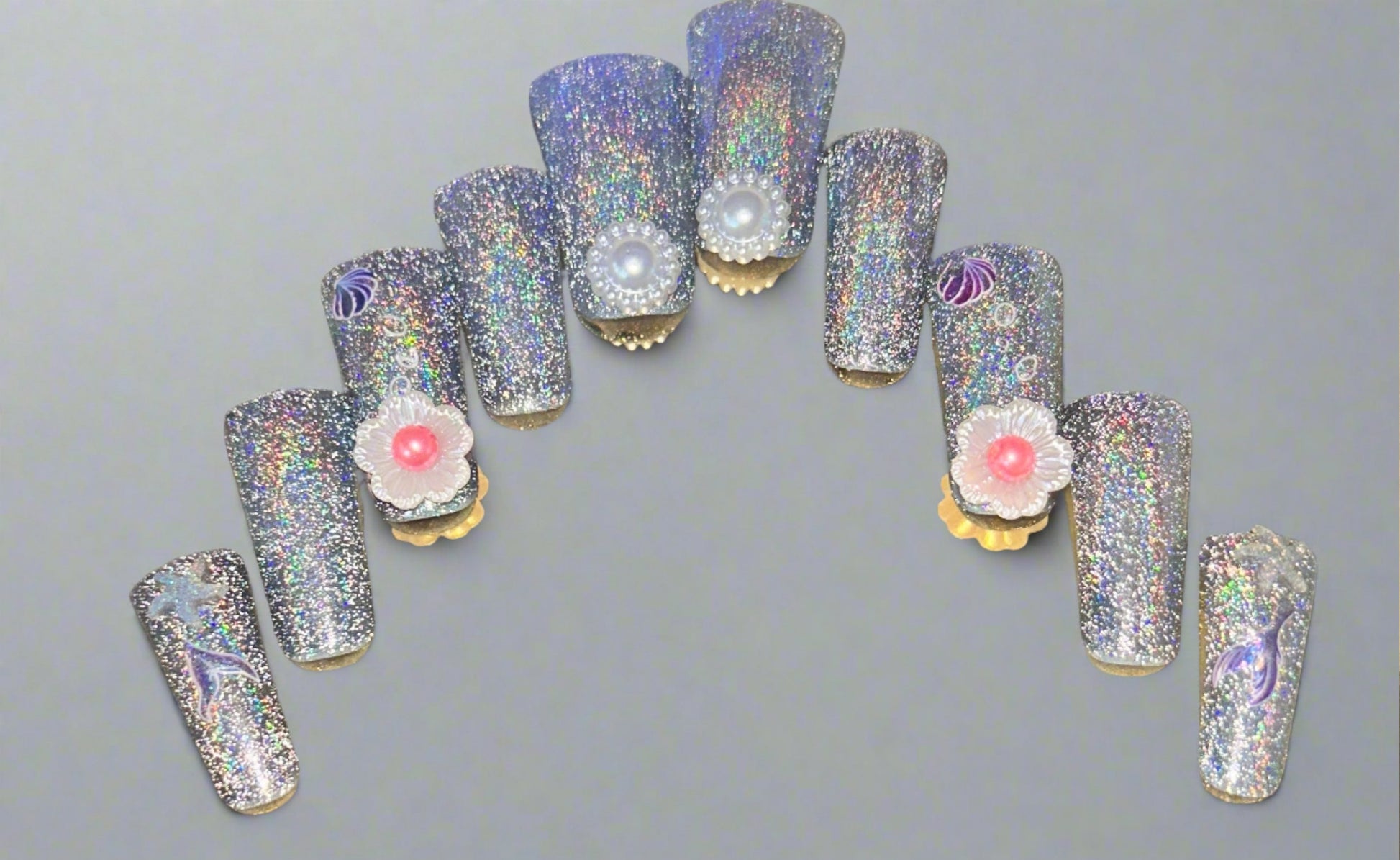 Set shown is an long length and duck shape with pearls. 100% acrylic press on handmade! Each press on has a thin layer of acrylic plus a gel design.
