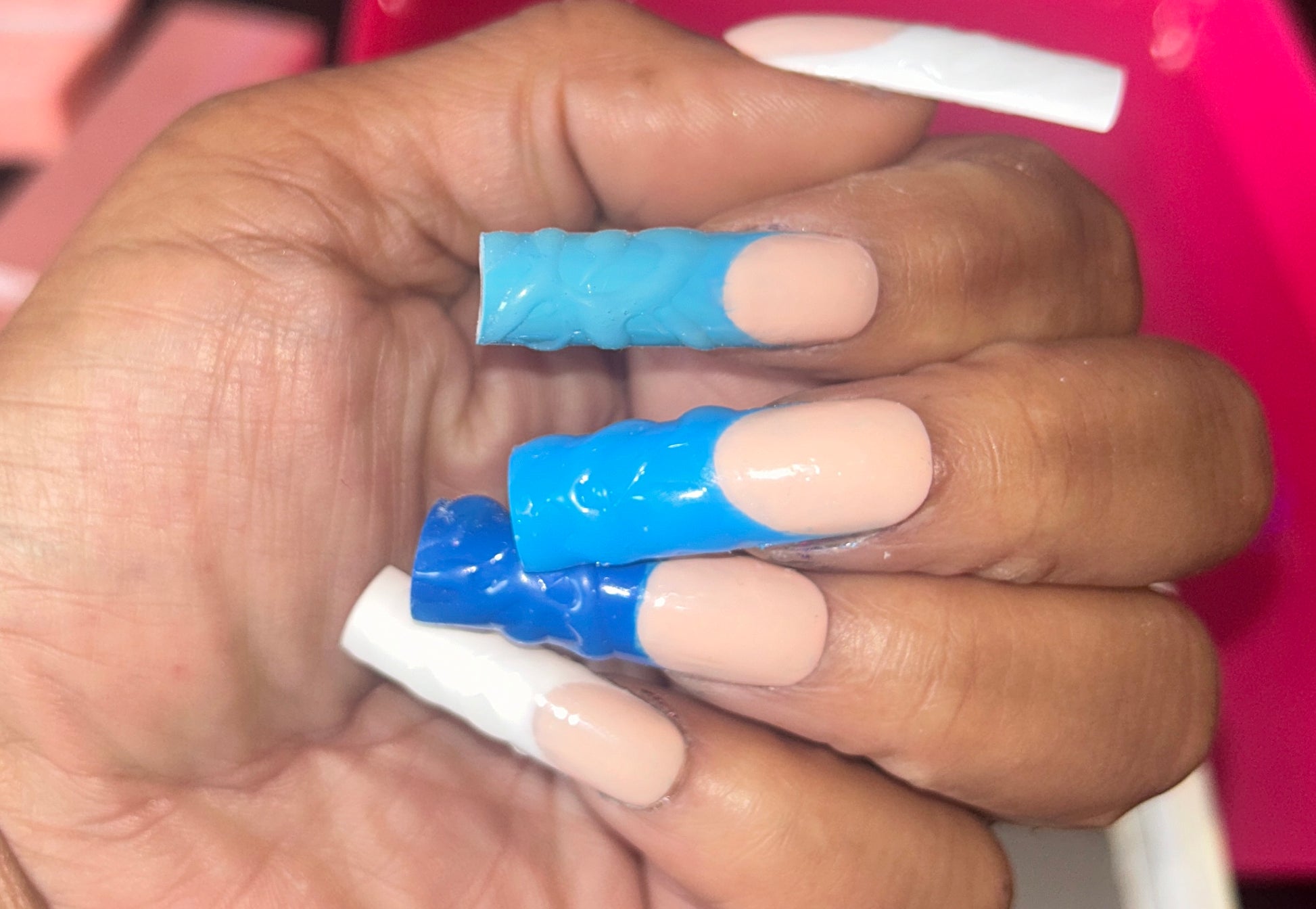 Set shown is an XL length and coffin shape with blue french tips. 100% acrylic press on handmade! Each press on has a thin layer of acrylic plus a gel design.