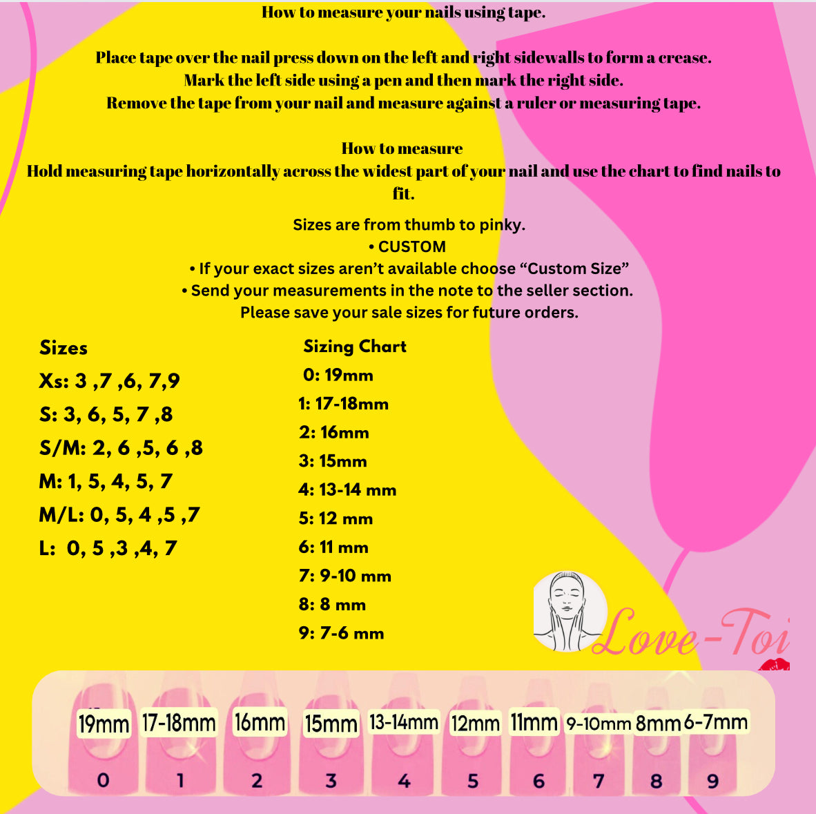 Please ensure to place in the note to seller section the custom size if nails don’t match the pre- defined sets. Thanks.