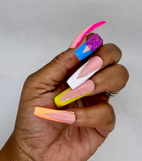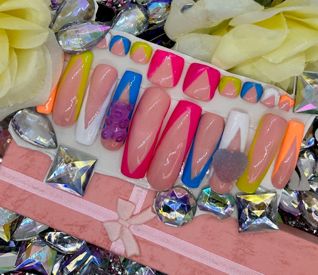Set shown is a XL length and square shape with french tips. 100% acrylic press on handmade! Each press on has a thin layer of acrylic plus a gel design.