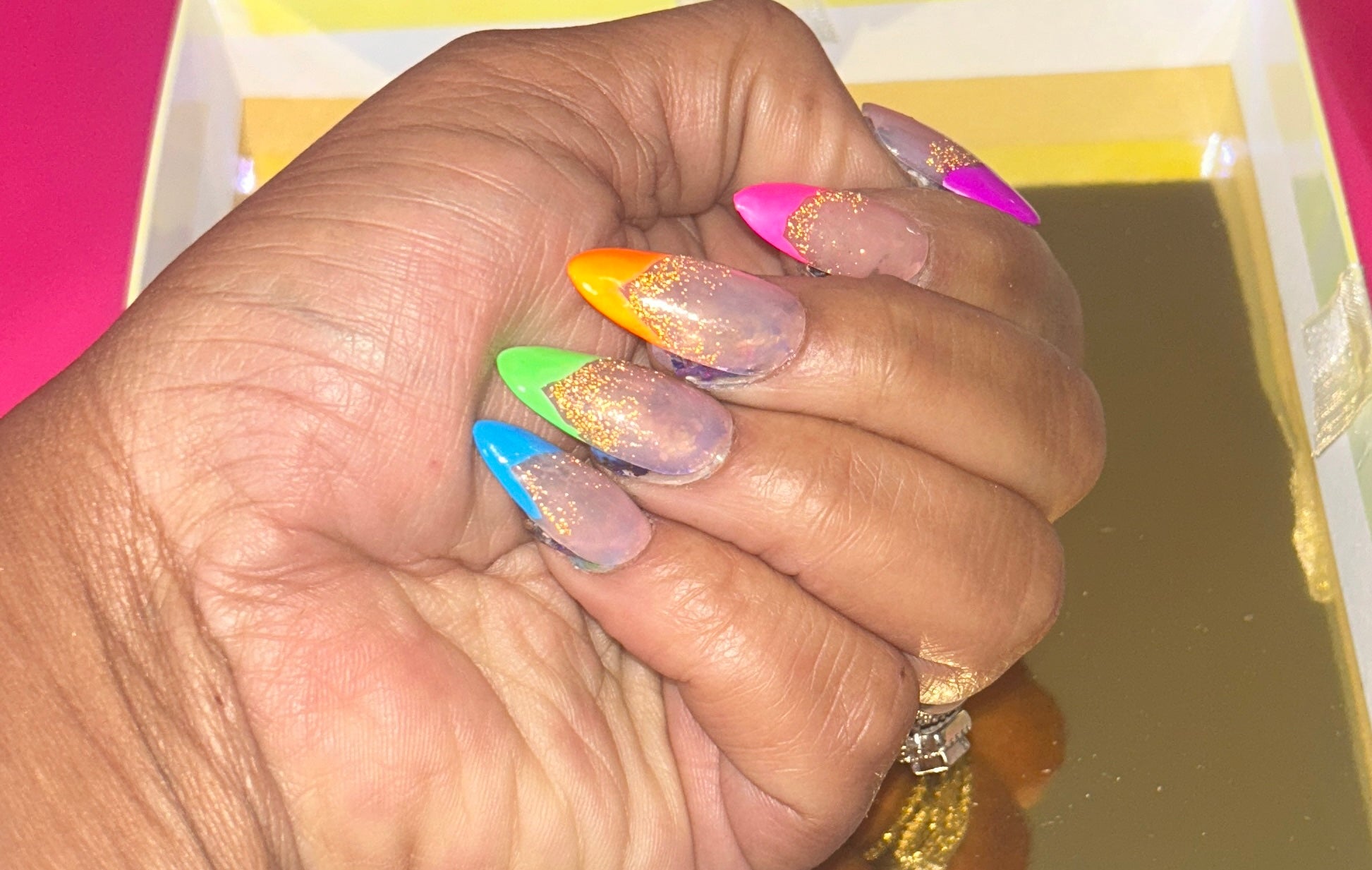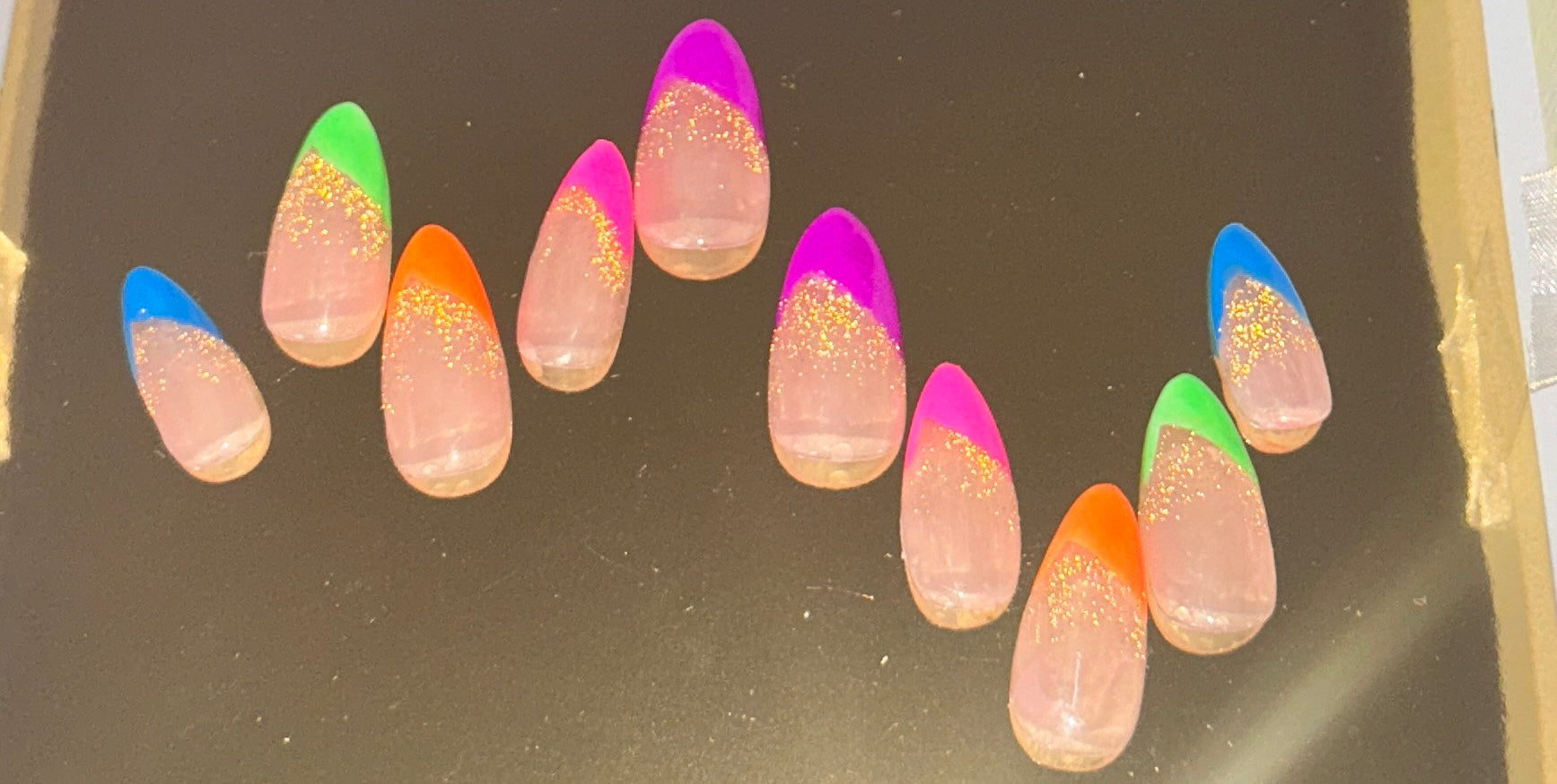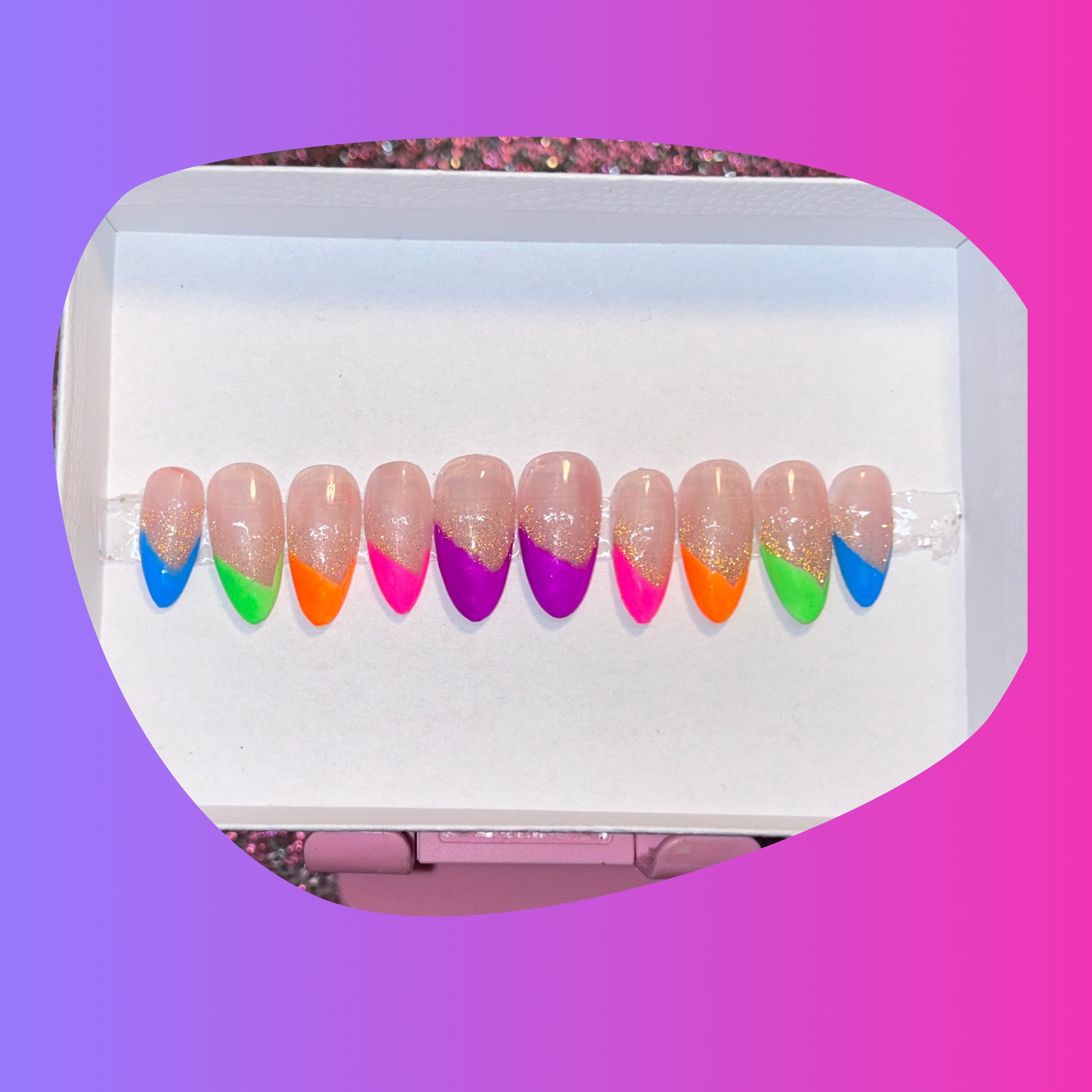 Set shown is a short length and almond shape with color french tips. 100% acrylic press on handmade! Each press on has a thin layer of acrylic plus a gel design.