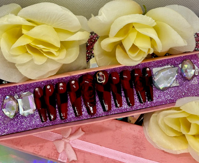 Set shown is a long length and coffin shape. 100% acrylic press on handmade! Each press on has a thin layer of acrylic plus a gel design.